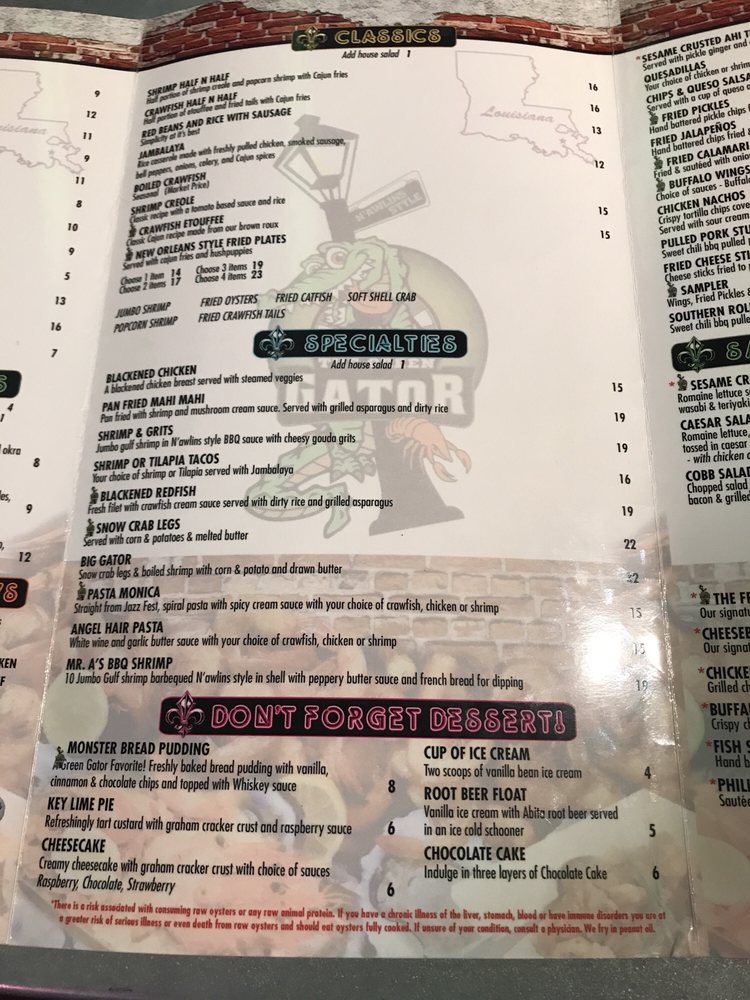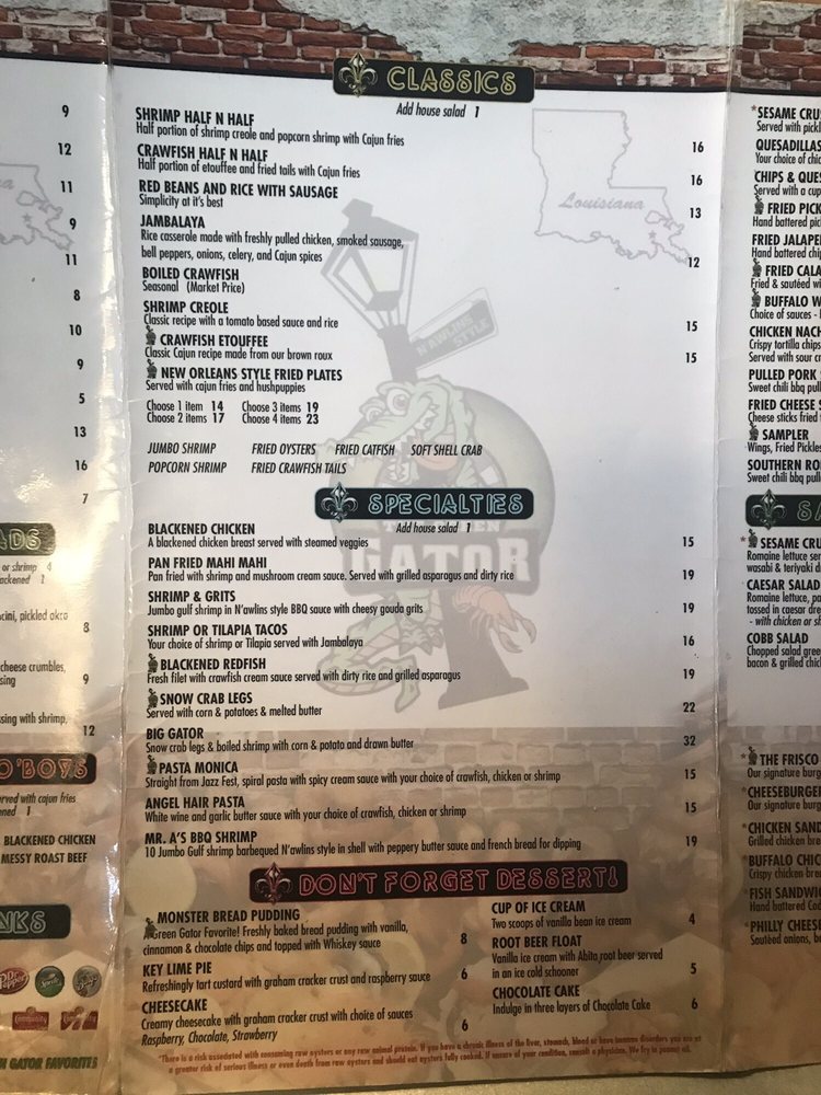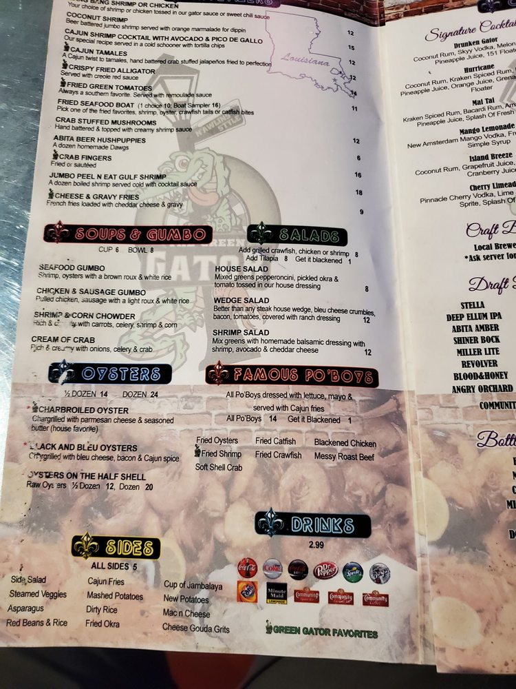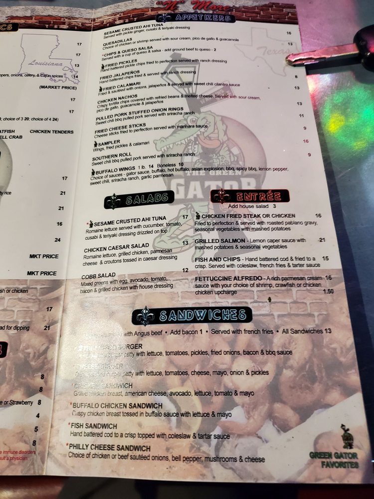 Introducing The Green Gator, a vibrant sports bar in Frisco, TX, offering Cajun/Creole and American dishes with vegan options. The menu boasts classics like Catfish, Jambalaya, and Fettuccine Alfredo, along with unique Cajun Asian dishes like Gators Fried Rice. Customers rave about the attentive service and flavorful food, with standouts like charbroiled oysters and shrimp and grits. The atmosphere is lively, making it a great spot for groups and kids. The diverse beverage selection and happy hour specials add to the overall experience. With a welcoming staff, festive ambiance, and consistently delicious food, The Green Gator is a must-visit destination for those craving authentic Cajun flavors.